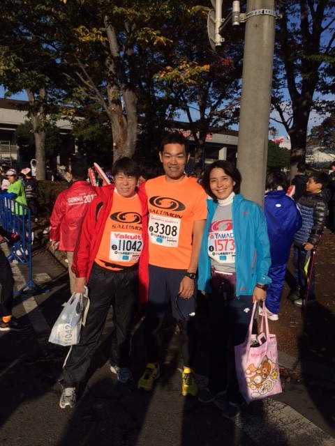 レース仲間二人もフルマラソンに参加!!全員、完走しました。それにしてもフルマラソンのコースはすごい!敷島競技場→17号→田口(群馬アリーナの北側)→国体道路→大渡橋→高崎イオンモール→総社町→17号→高崎環状線→箱田→県庁とういう、車で走っても大変なコースです。コース設定以上に驚いたのは、完走してゴールする選手の数と面々です。明らかに60〜70代なのに、サブ4(4時間未満)でゴールする人が多いこと!驚きです。私たちなんぞは、まだまだヒヨッコです。
