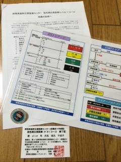 災害医療とは?から始まり、トリアージ(災害時に急性期の受傷者の中から、一人でも多くの傷病者の命を救うためとられる方法で、今回は最初に使われる篩い分けの方法、START法を学び、習得しました。)、災害医療の基本となる考え方CSCATTT(災害医療にとりかかる際に最優先で取り組むべき決定事項と手順7項目)とMETHANE(基本となる情報7項目)、無線機でのコミュニケーション方法等を勉強してきました。コースの最後には実技テストと筆記テストが・・・。無事、受講者全員、合格しました。修了証とバッチをいただいて帰ってきました。