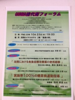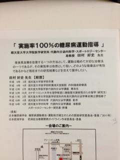医師会共催の、GUNMA糖代謝フォーラムの勉強会に参加してきました。「実施率100%の糖尿病運動指導」という順天堂大学の田村好史先生の講演からは、糖尿病の運動指導で、どのような指導法が有効であるかについて、今まで得られている最新の研究結果も含めて、色々な情報が得られました。