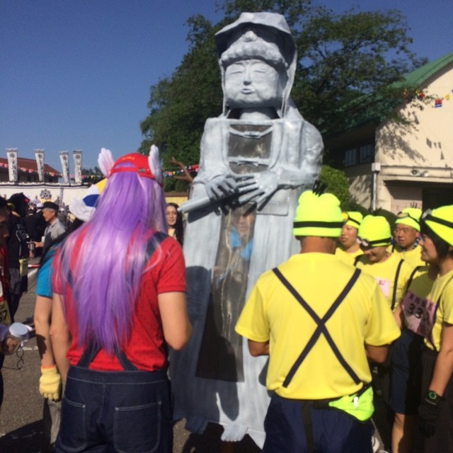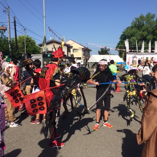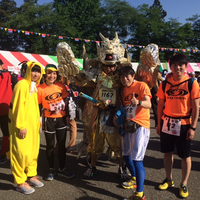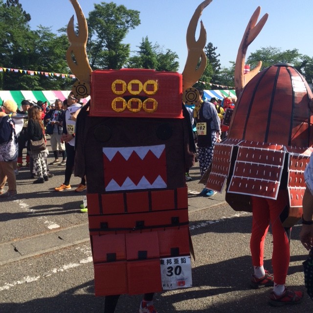 例年にもれず、すごい仮装をした人達がわんさか!!普通の格好の私たちはむしろ浮いてしまっています。仮装率8〜9割といったところでしょうか。そのほとんどが手作りです。みなさんアイデアがすごい。気合いが入っています。この仮装を見ながら走るのがまた楽しいのです。それにしても、このすごい仮装で20kmを走るのですから、ただごとではありません。関所コースのゴール地点までほぼ途絶えることなくつづく、沿道の市民のみなさんの応援にも励まされす。